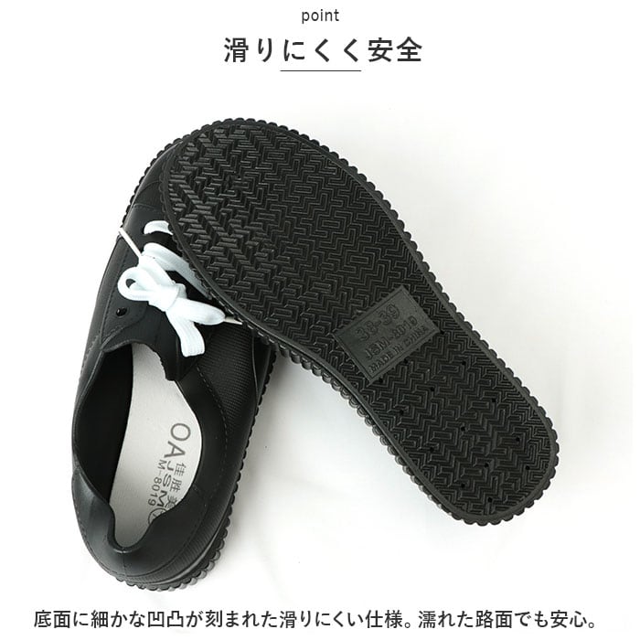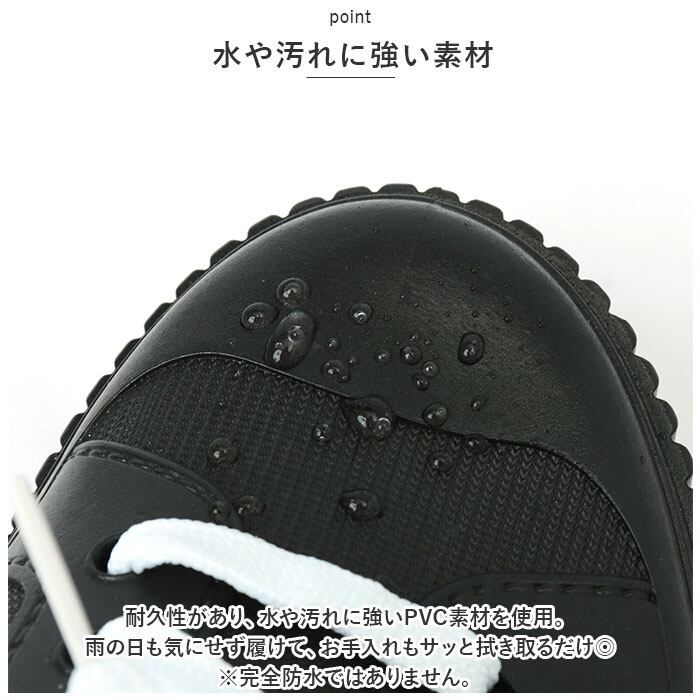 ・耐久性があり、水や汚れに強いPVC素材を使用。雨の日も気にせず履けて、お手入れもサッと拭き取るだけ◎(※完全防水ではありません。)