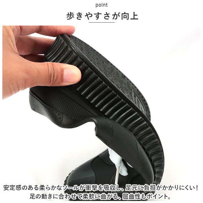 ・安定感のある柔らかなソールが衝撃を吸収し、足元に負担がかかりにくい!足の動きに合わせて柔軟に曲がる、屈曲性もポイント。