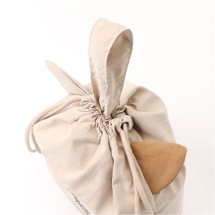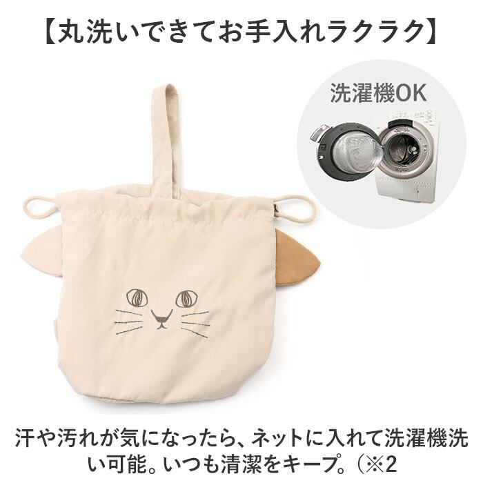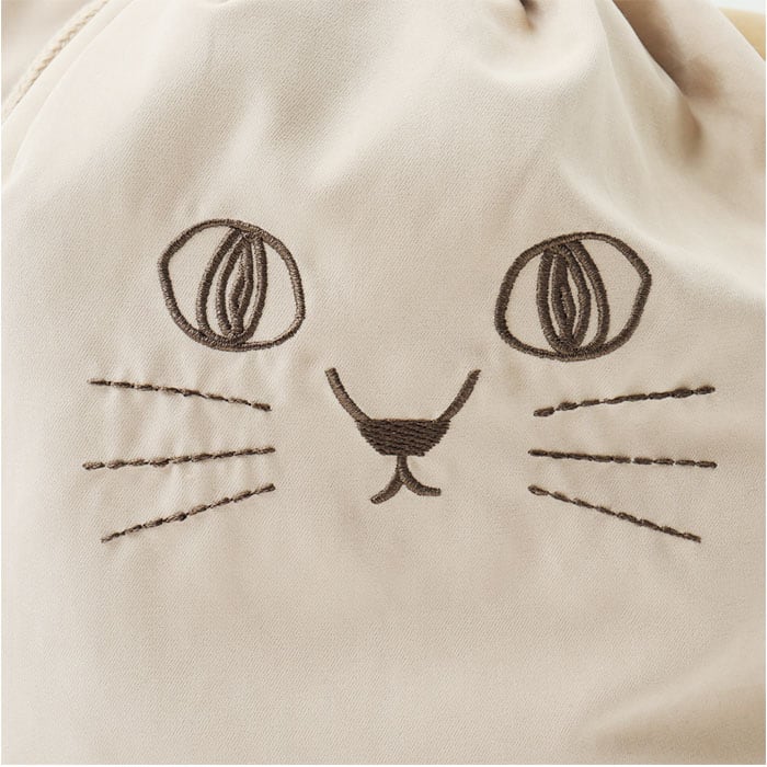 ・両サイドの紐を絞って結ぶ、巾着タイプ。キュッと絞ると、にゃふにゃふの顔型に♪