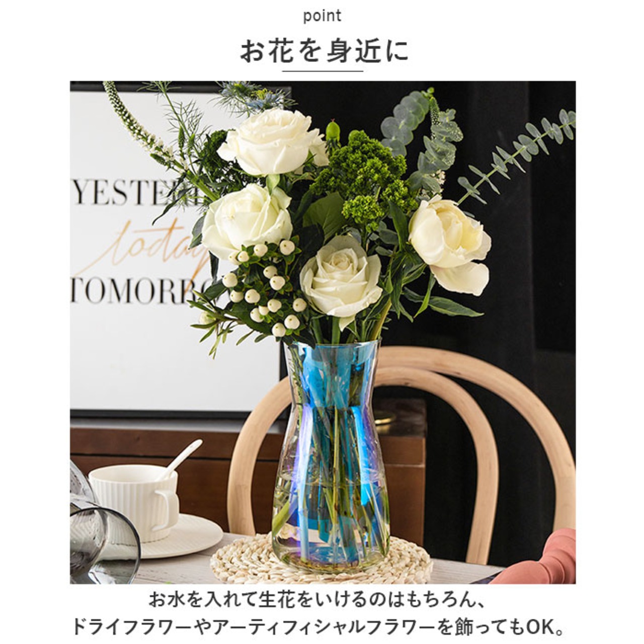 ・お水を入れて生花をいけるのはもちろん、ドライフラワーやアーティフィシャルフラワーを飾ってもOK。