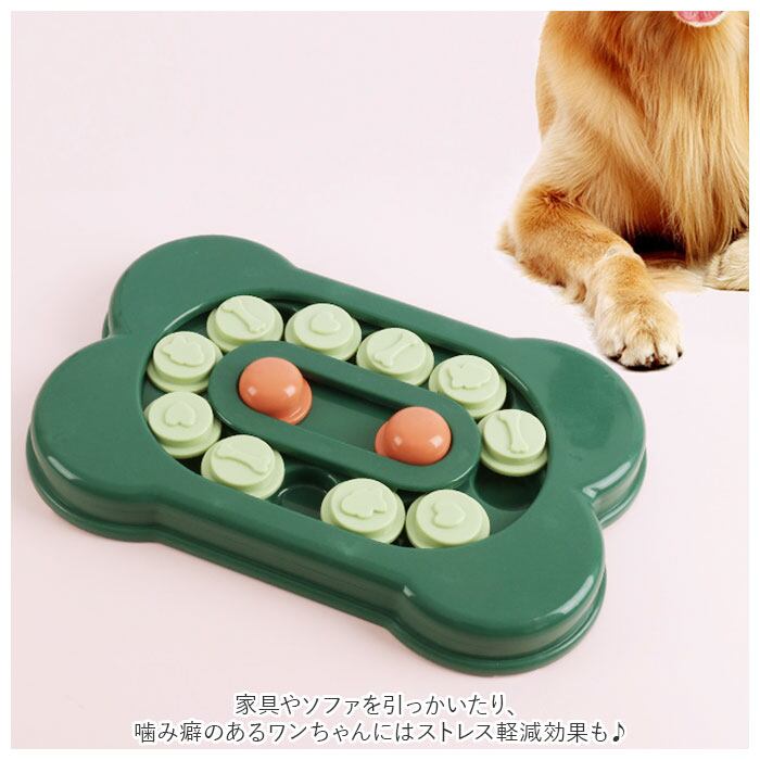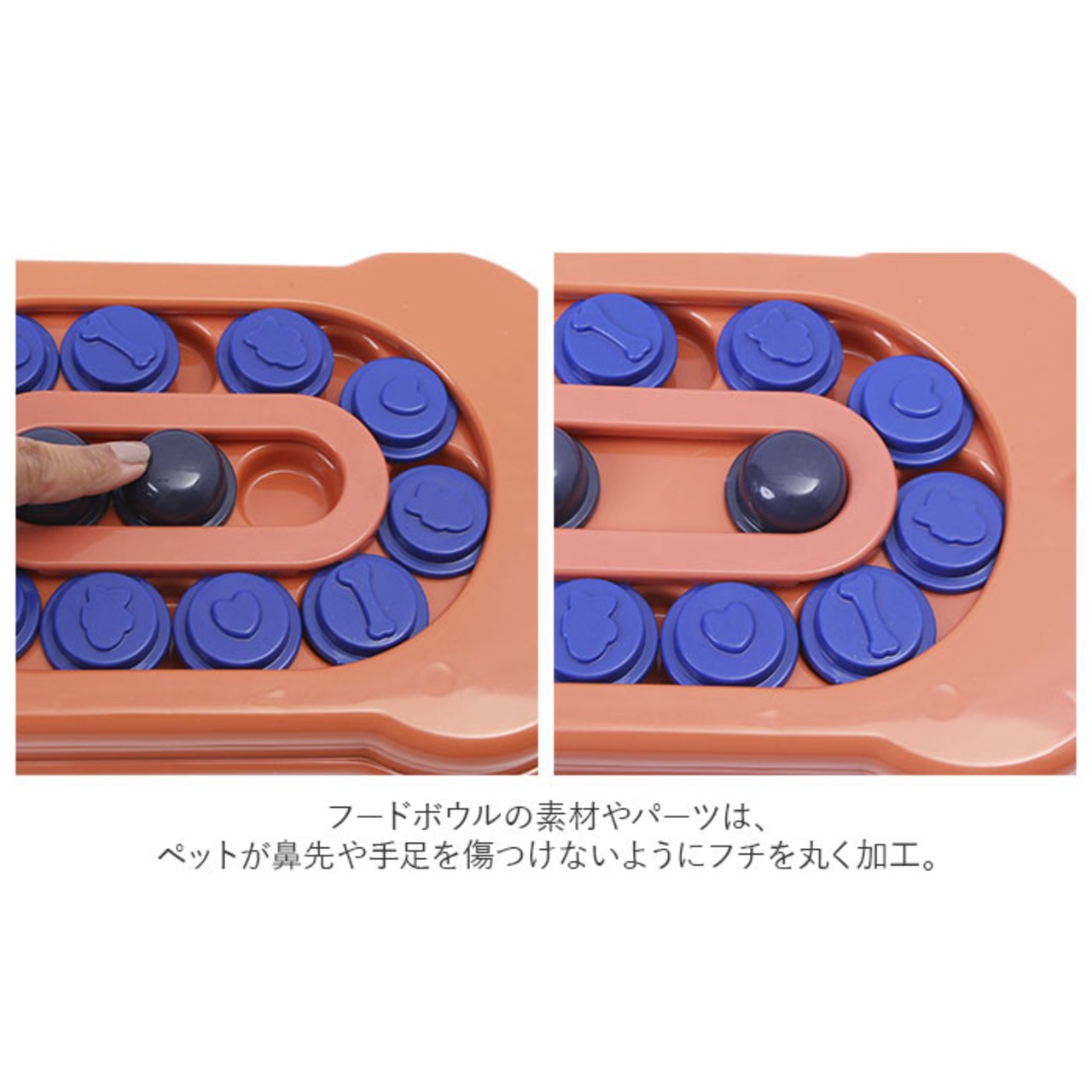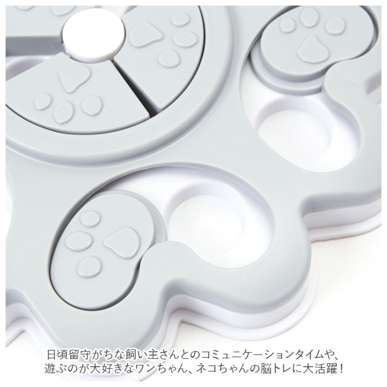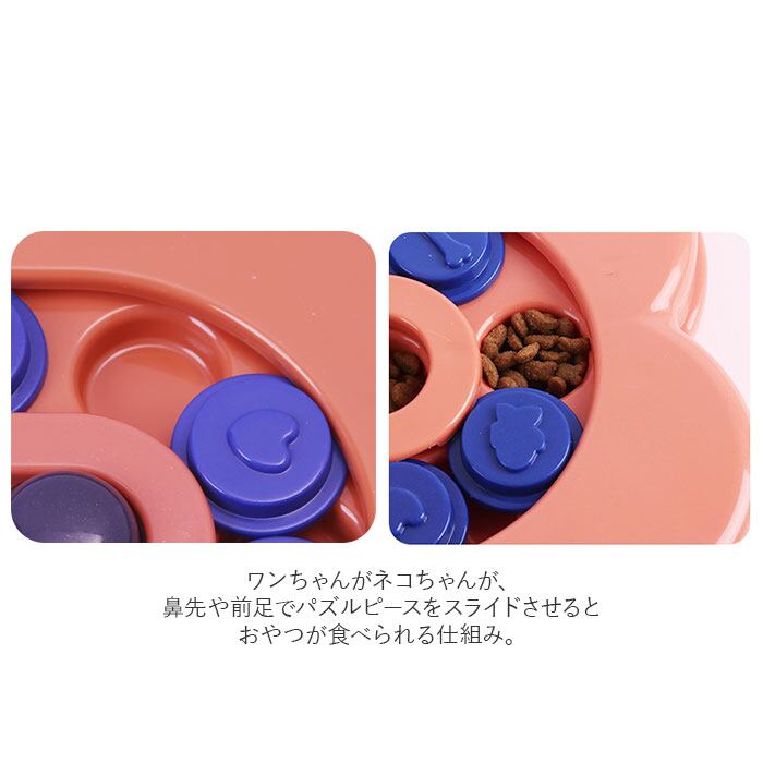・ワンちゃんがネコちゃんが、鼻先や前足でパズルピースをスライドさせるとおやつが食べられる仕組み。