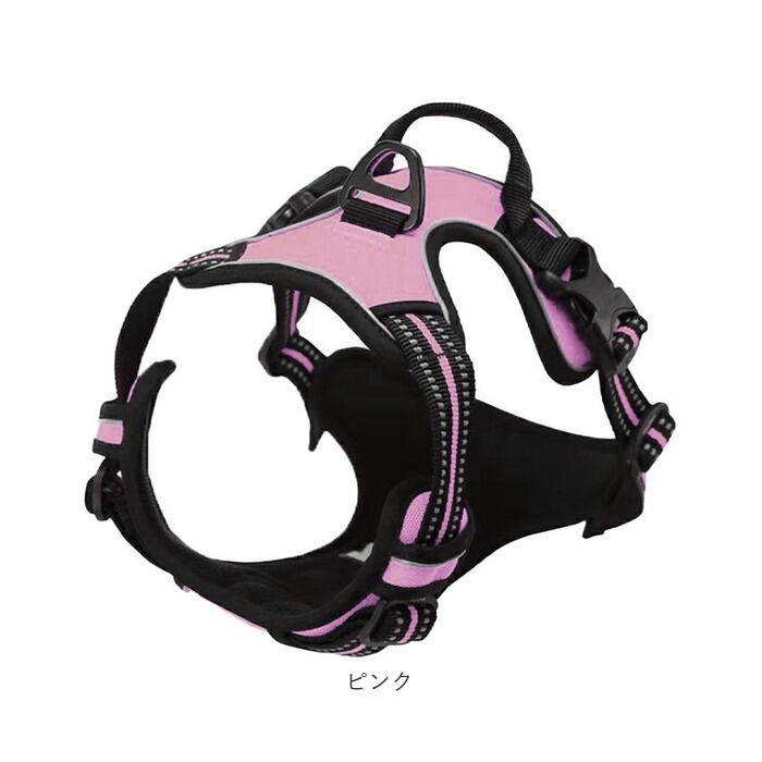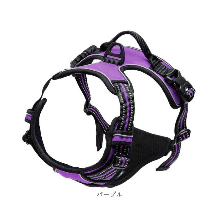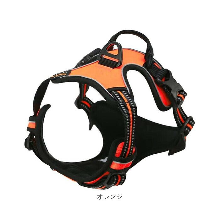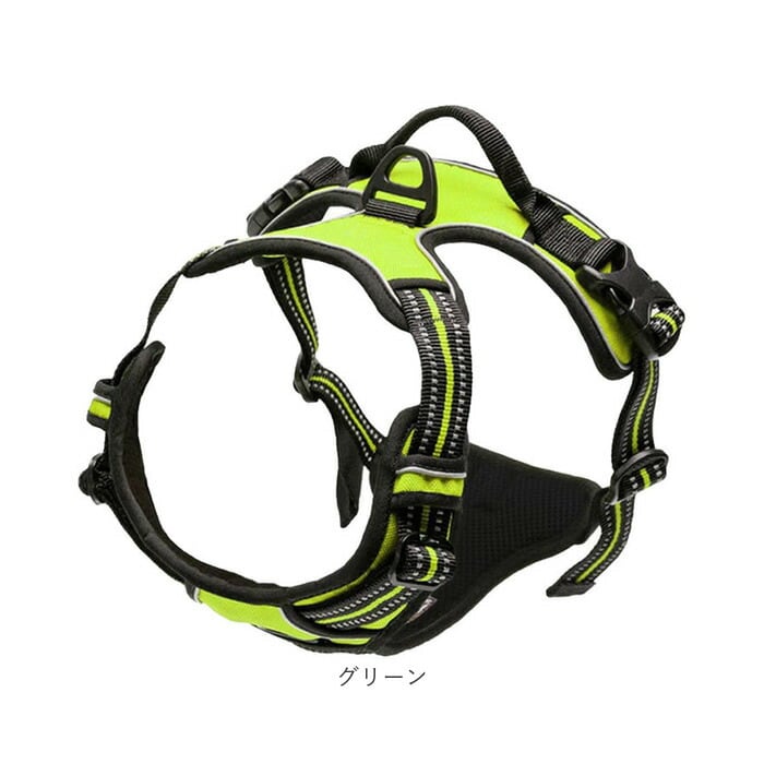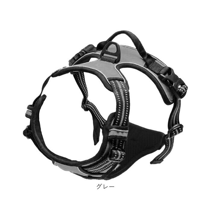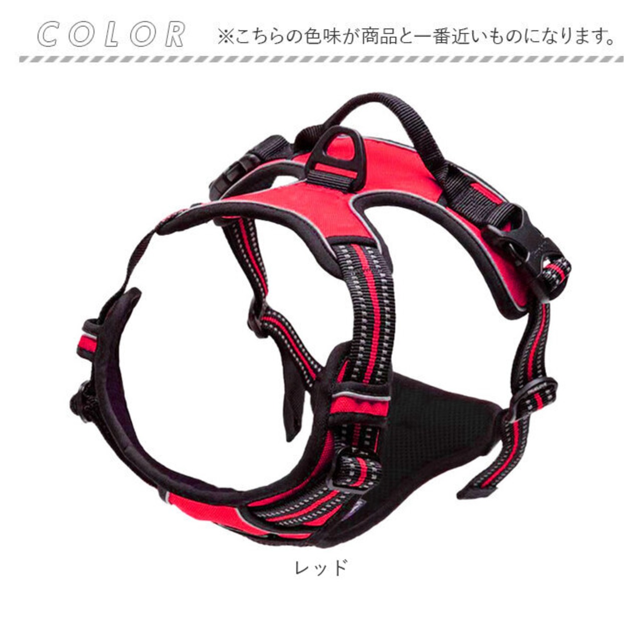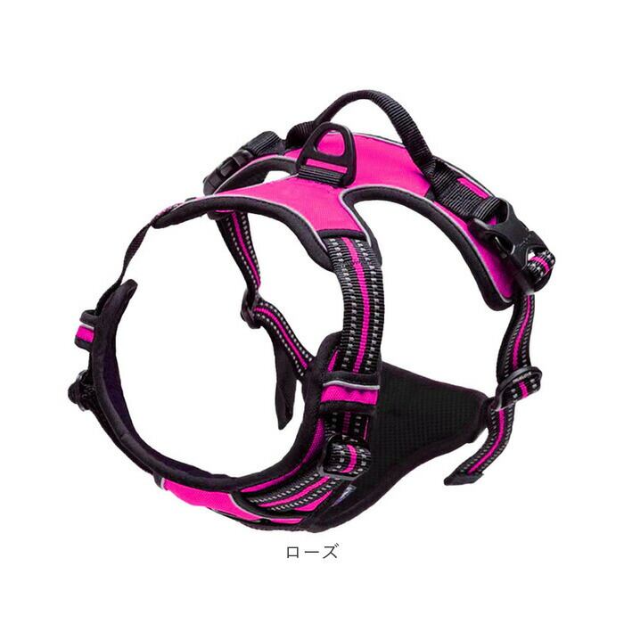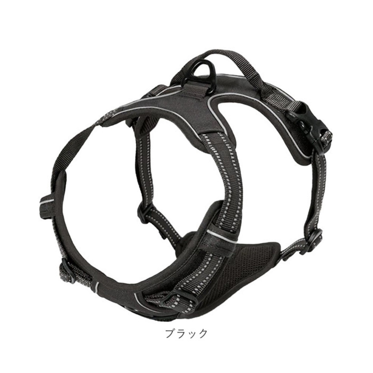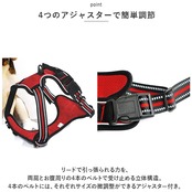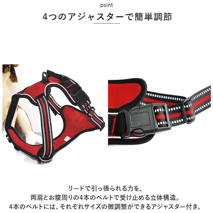 ・リードで引っ張られる力を、両肩とお腹周りの4本のベルトで受け止める立体構造。4本のベルトには、それぞれサイズの微調整ができるアジャスター付き。