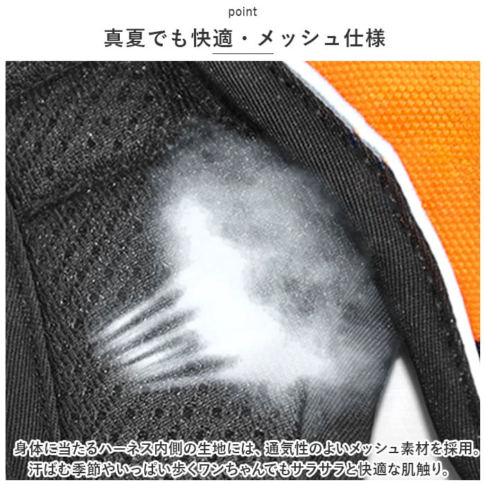 ・身体に当たるハーネス内側の生地には、通気性のよいメッシュ素材を採用。汗ばむ季節やいっぱい歩くワンちゃんでもサラサラと快適な肌触り。