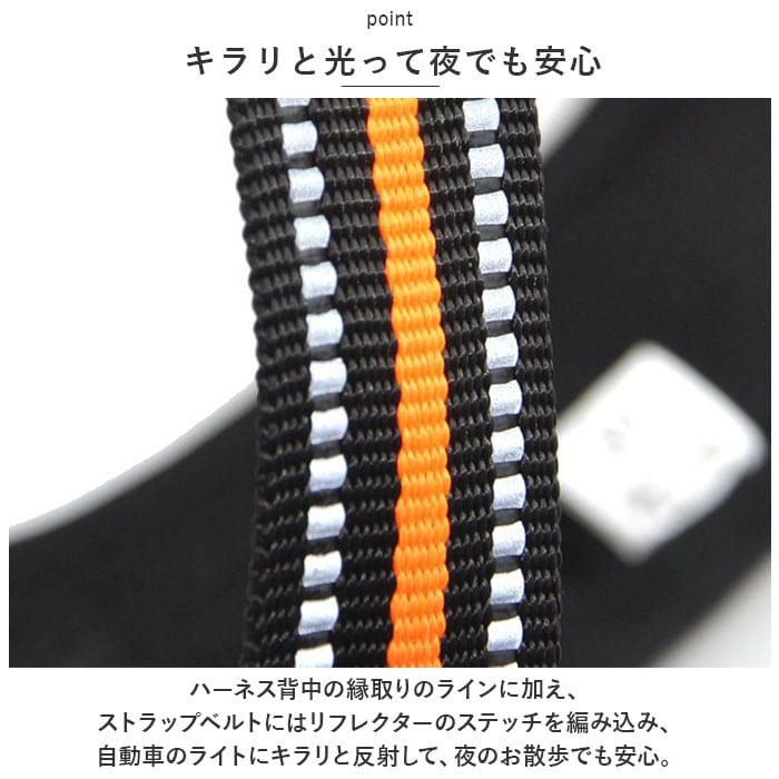 ・ハーネス背中の縁取りのラインに加え、ストラップベルトにはリフレクターのステッチを編み込み、自動車のライトにキラリと反射して、夜のお散歩でも安心。