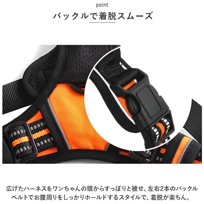 ・広げたハーネスをワンちゃんの頭からすっぽりと被せ、左右2本のバックルベルトでお腹周りをしっかりホールドするスタイルで、着脱が楽ちん。