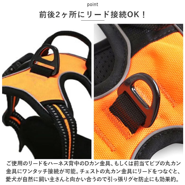 ・ご使用のリードをハーネス背中のDカン金具、もしくは前当てビブの丸カン金具にワンタッチ接続が可能。チェストの丸カン金具にリードをつなぐと、愛犬が自然に飼い主さんと向かい合うので引っ張りグセ防止にも効果的。
