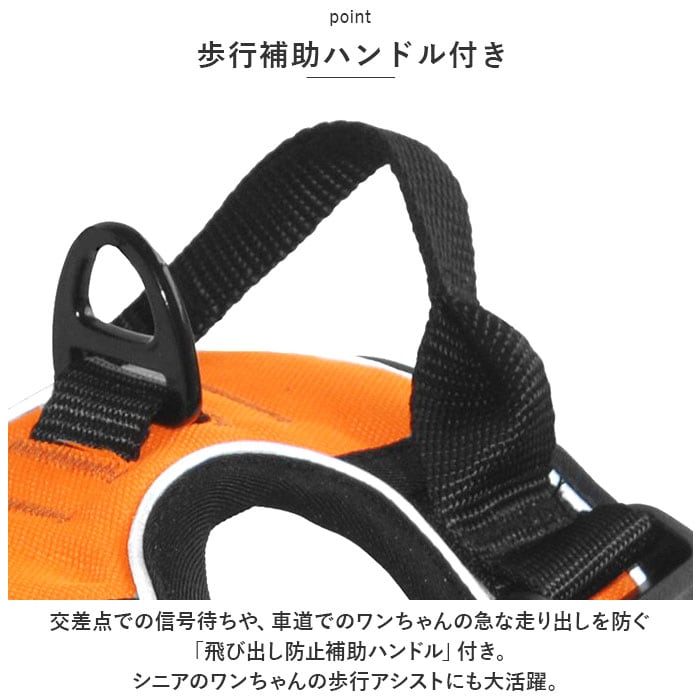 ・交差点での信号待ちや、車道でのワンちゃんの急な走り出しを防ぐ「飛び出し防止補助ハンドル」付き。シニアのワンちゃんの歩行アシストにも大活躍。