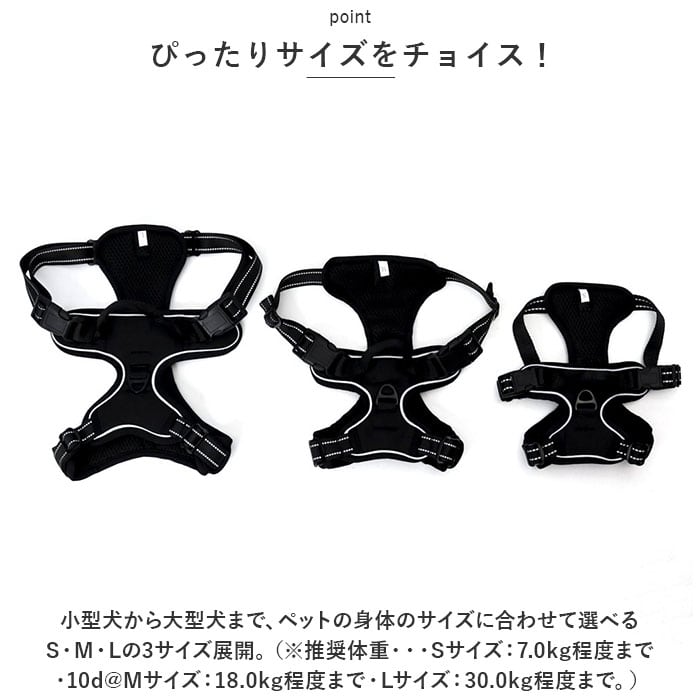 ・小型犬から大型犬まで、ペットの身体のサイズに合わせて選べるS・M・Lの3サイズ展開。(※推奨体重・・・Sサイズ:7.0kg程度まで・Mサイズ:18.0kg程度まで・Lサイズ:30.0kg程度まで。)