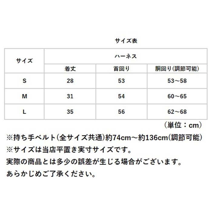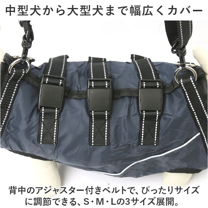 ※背中のアジャスター付きベルトで、ぴったりサイズに調節できる、S・M・Lの3サイズ展開。中型犬から、胴回り68cm程度の大型のワンちゃんでも着用できるサイズ感。
