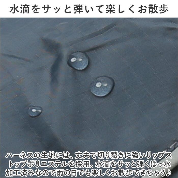 ・ハーネスの生地には、丈夫で切り裂きに強いリップストップポリエステルを採用。水滴をサッと弾くはっ水加工済みなので雨の日でも楽しくお散歩できちゃう♪