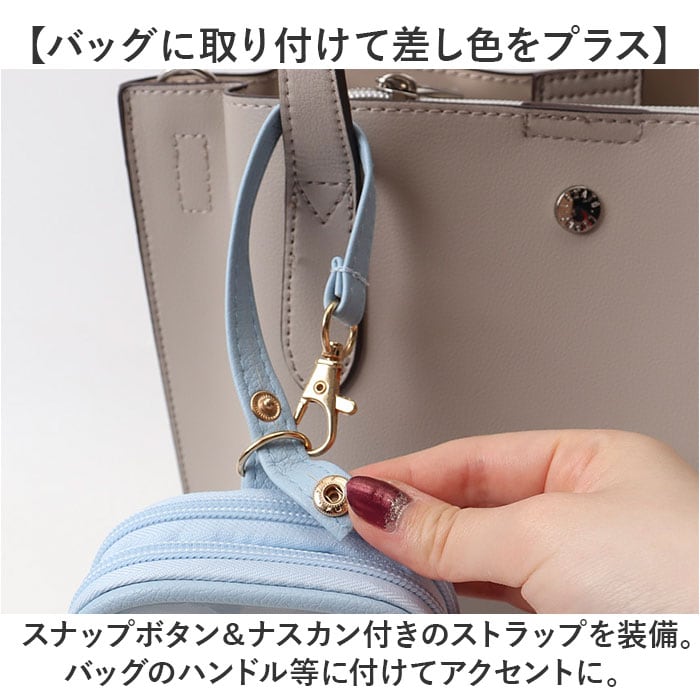 ・スナップボタン&ナスカン付きのストラップを装備。バッグのハンドル等に付けてアクセントに。