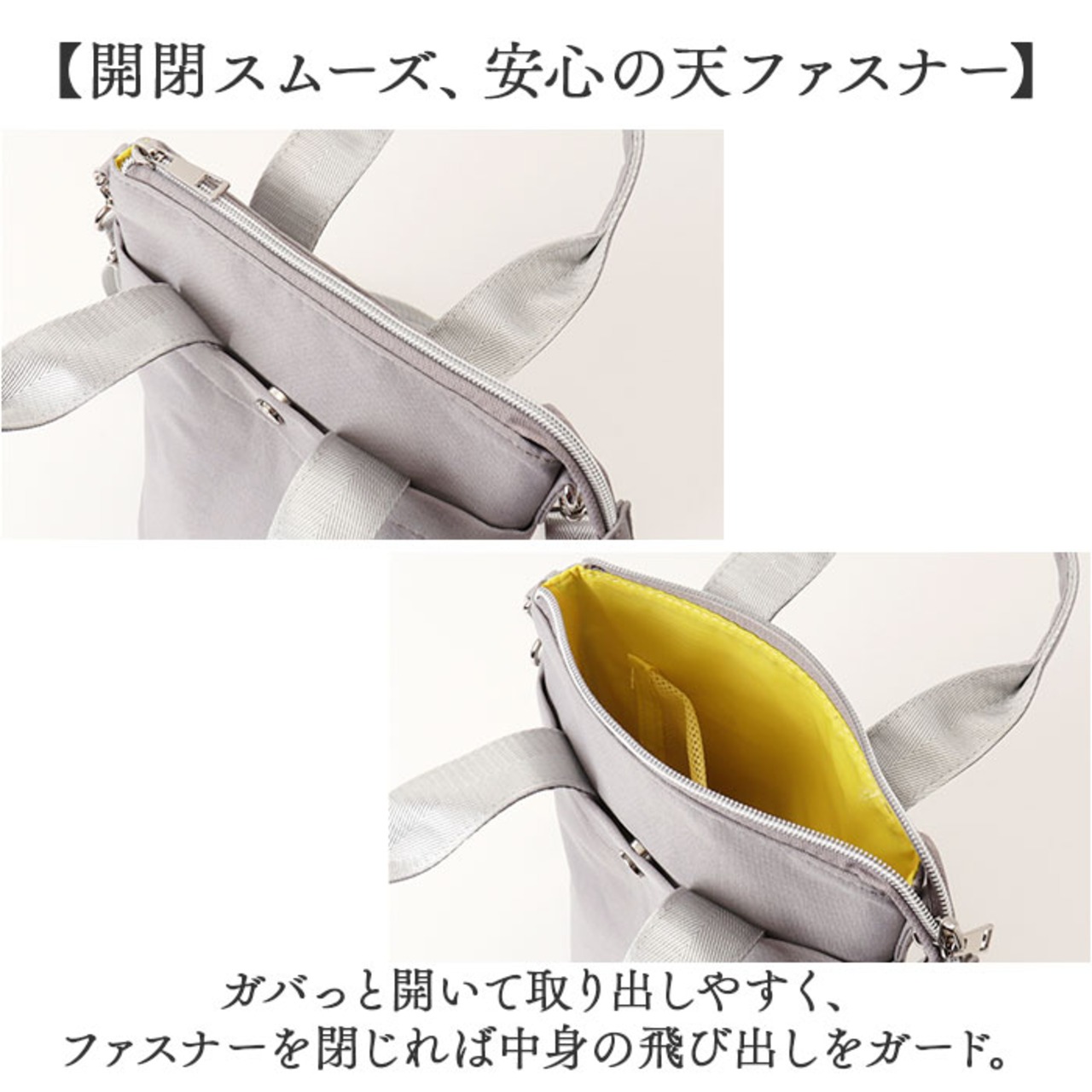 【開閉スムーズ、安心の天ファスナー】