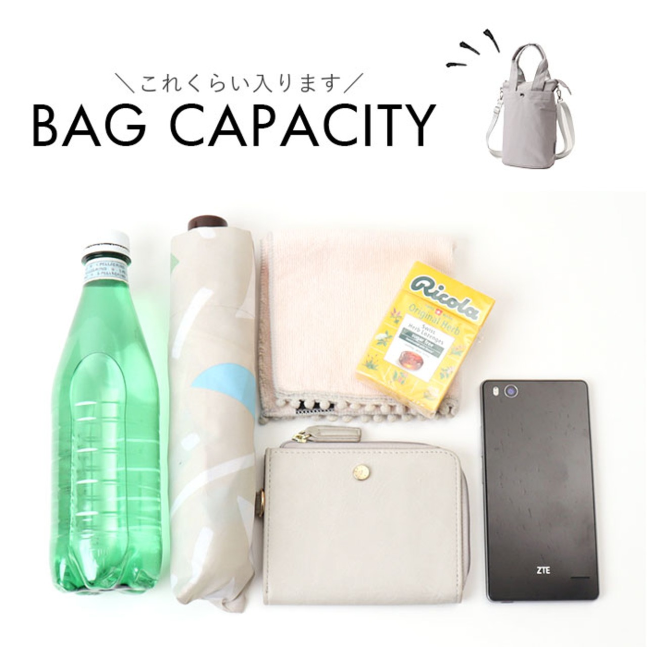 ・600mlペットボトル、ハンディファン、折りたたみ傘が縦向きに。スマートに持ち歩き!