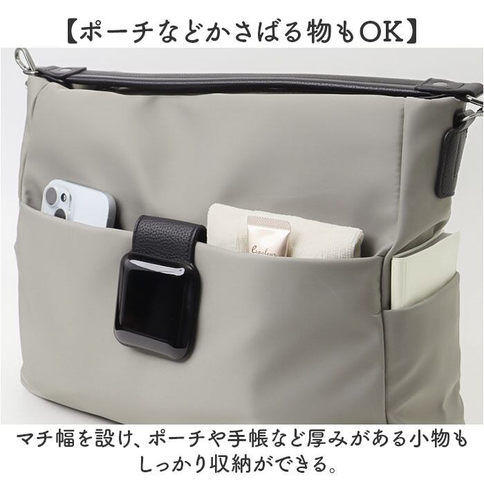・マチ幅を設け、ポーチや手帳など厚みがある小物もしっかり収納ができる。