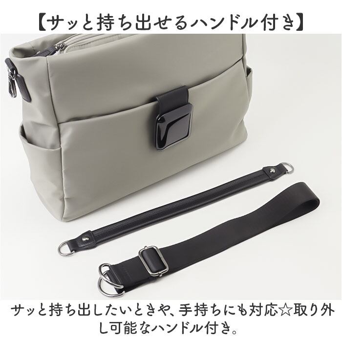 ・付属のショルダーベルトは長さ調節ができ、肩掛けや斜め掛けどちらもOK!持ち運びに便利。
