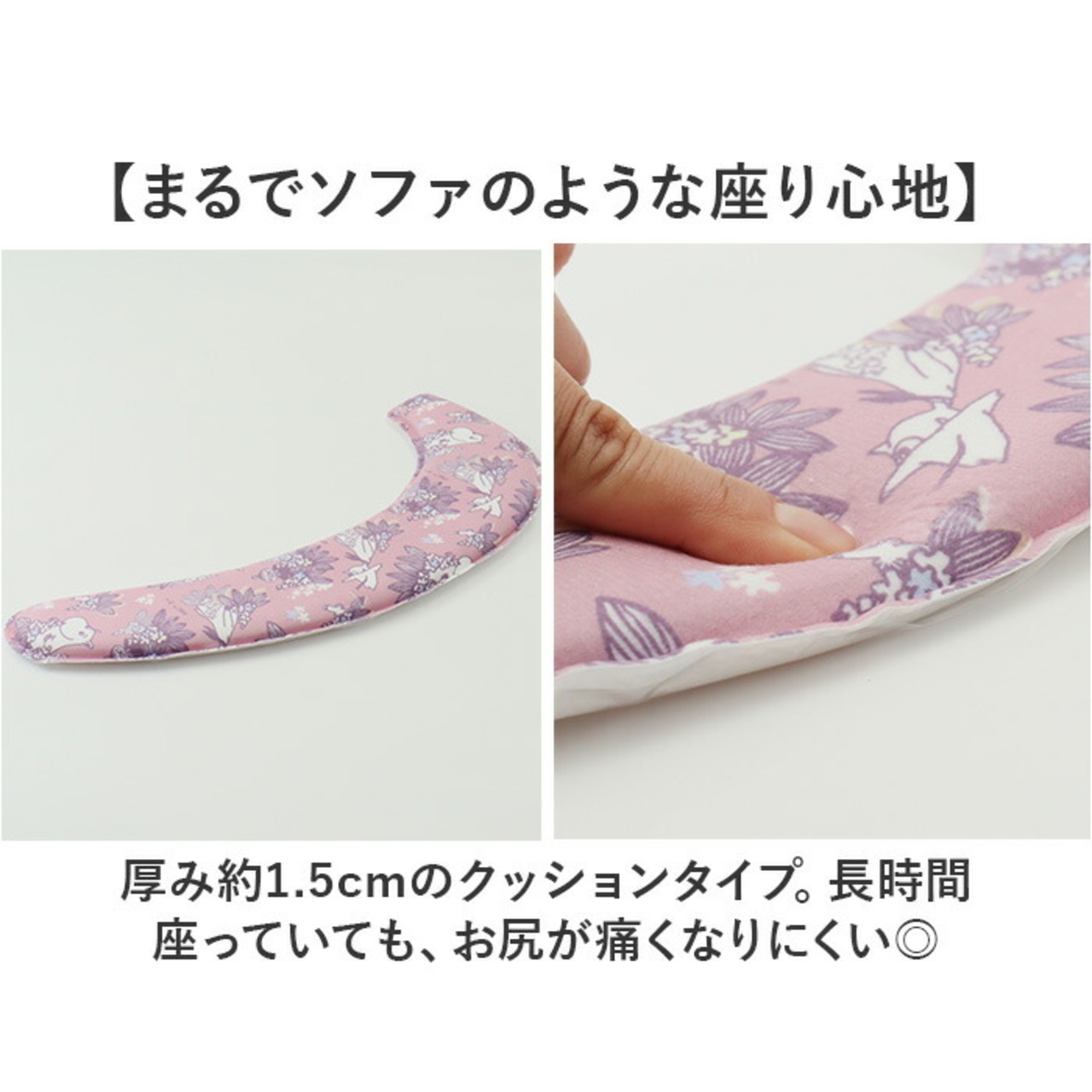 ・厚み約1.5cmのクッションタイプ。長時間座っていても、お尻が痛くなりにくい◎