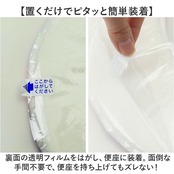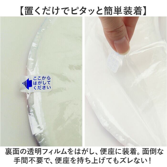 ・裏面の透明フィルムをはがし、便座に装着。面倒な手間不要で、便座を持ち上げてもズレない!