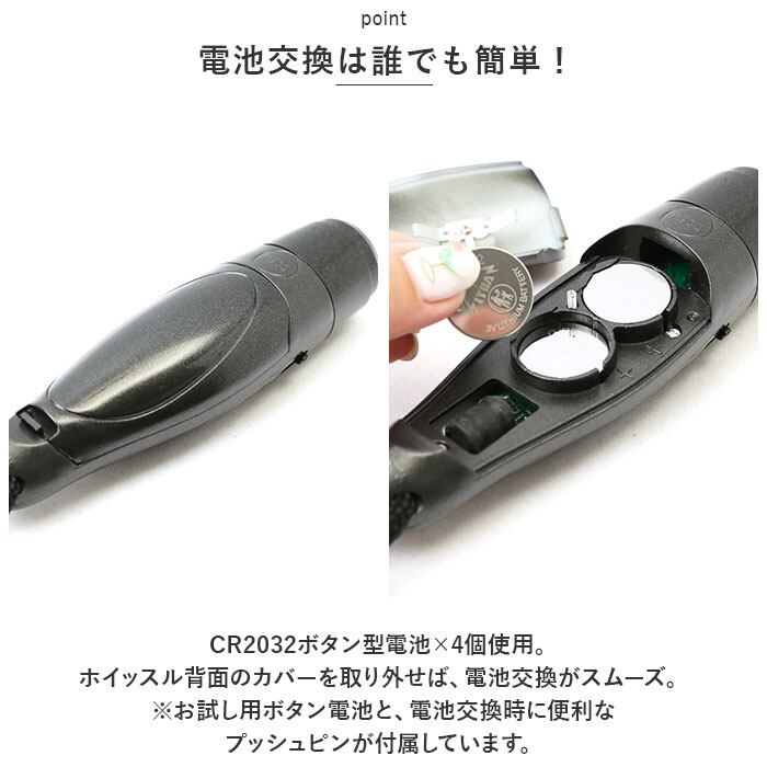 ・CR2032ボタン型電池×4個使用。ホイッスル背面のカバーを取り外せば、電池交換がスムーズ。(※お試し用ボタン電池と、電池交換時に便利なプッシュピンが付属しています。)