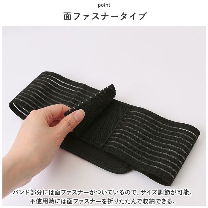・バンド部分には面ファスナーがついているので、サイズ調節が可能。不使用時には面ファスナーを折りたたんで収納できる。