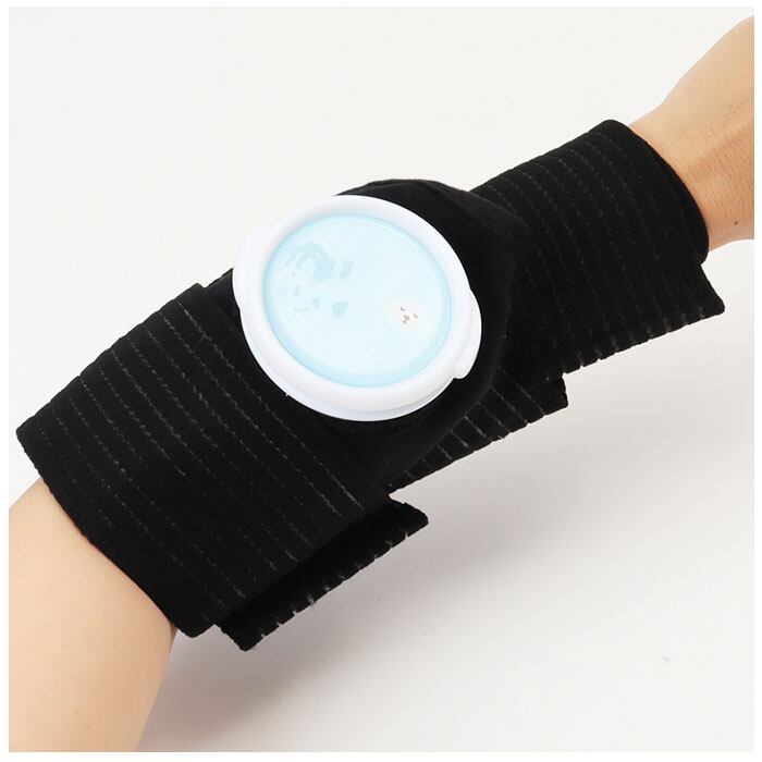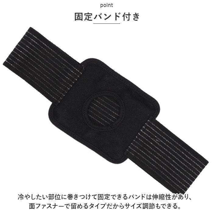 ・冷やしたい部位に巻きつけて固定できるバンドは伸縮性があり、面ファスナーで留めるタイプだからサイズ調節もできる。