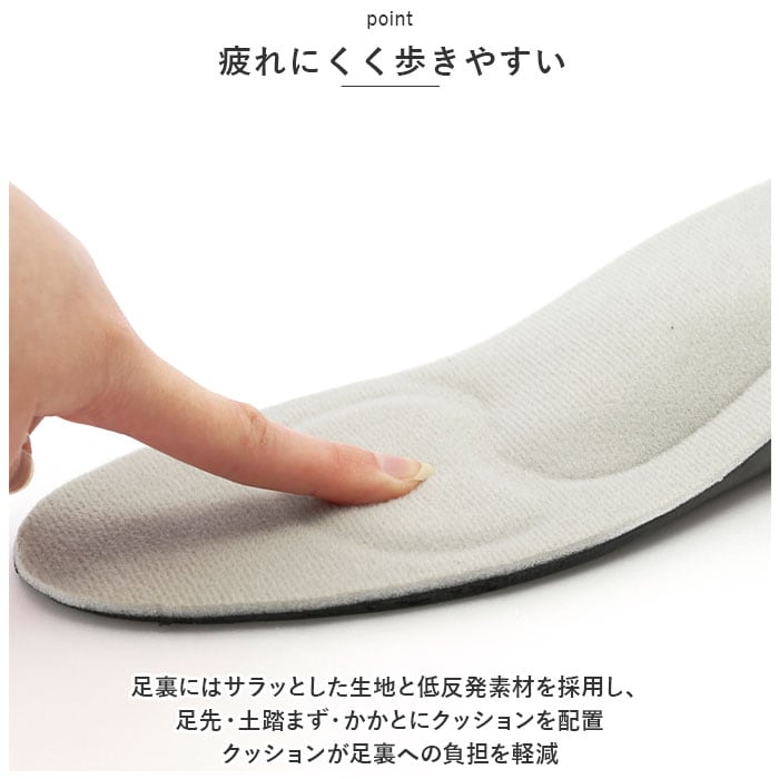 ・足裏にはサラッとした生地と低反発素材を採用し、足先・土踏まず・かかとにクッションを配置。クッションが足裏への負担を軽減し疲れにくく歩きやすい。