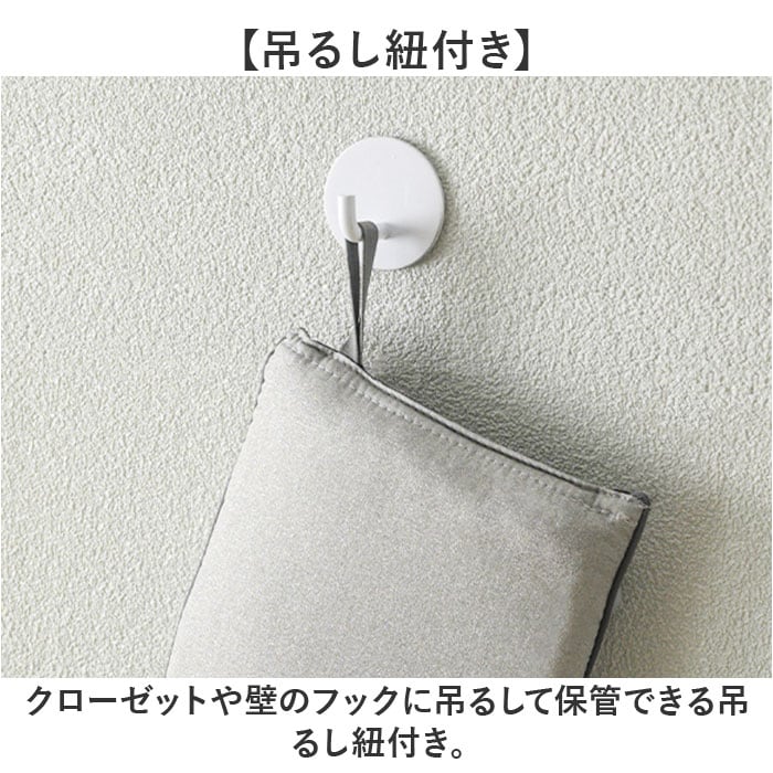 ・クローゼットや壁のフックに吊るして保管できる吊るし紐付き。