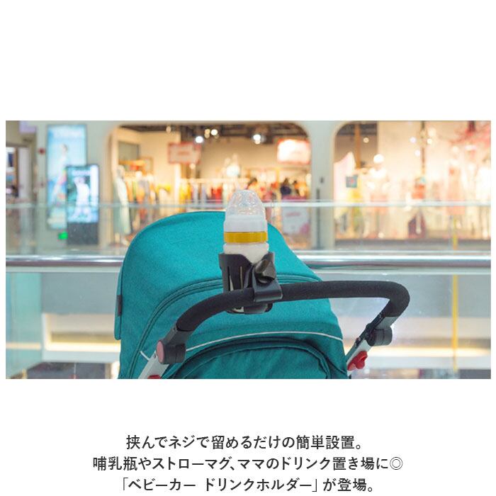 ・挟んでネジで留めるだけの簡単設置。哺乳瓶やストローマグ、ママのドリンク置き場に◎「ベビーカー ドリンクホルダー」が登場。
