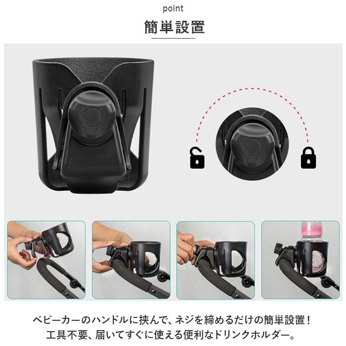 ・ベビーカーのハンドルに挟んで、ネジを締めるだけの簡単設置!工具不要、届いてすぐに使える便利なドリンクホルダー。