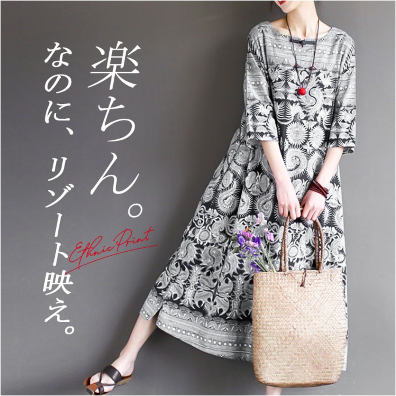 ・エスニックな雰囲気の総柄デザイン。リゾートシーンにぴったりな、存在感のあるアイテム♪