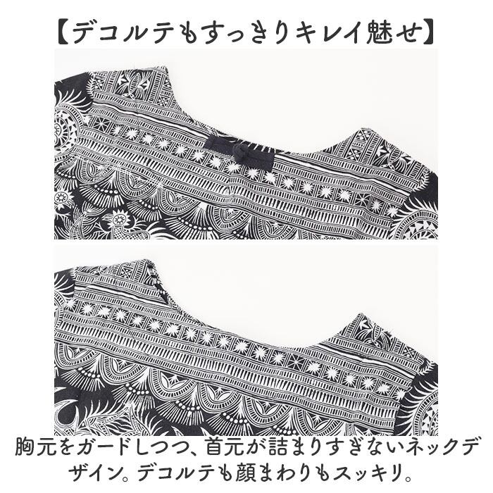 ・胸元をガードしつつ、首元が詰まりすぎないネックデザイン。デコルテも顔まわりもスッキリ。