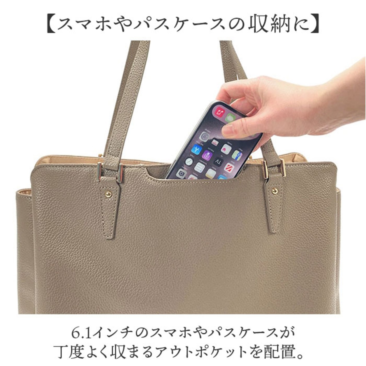 ・6.1インチのスマホやパスケースが丁度よく収まるアウトポケットを配置。