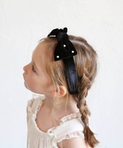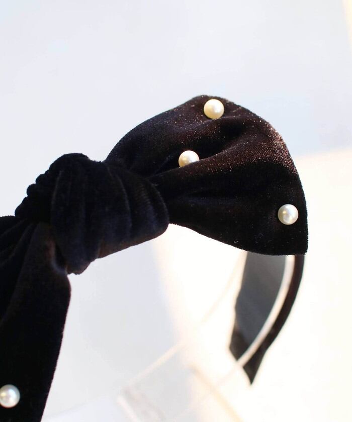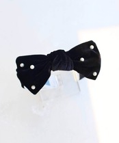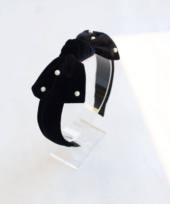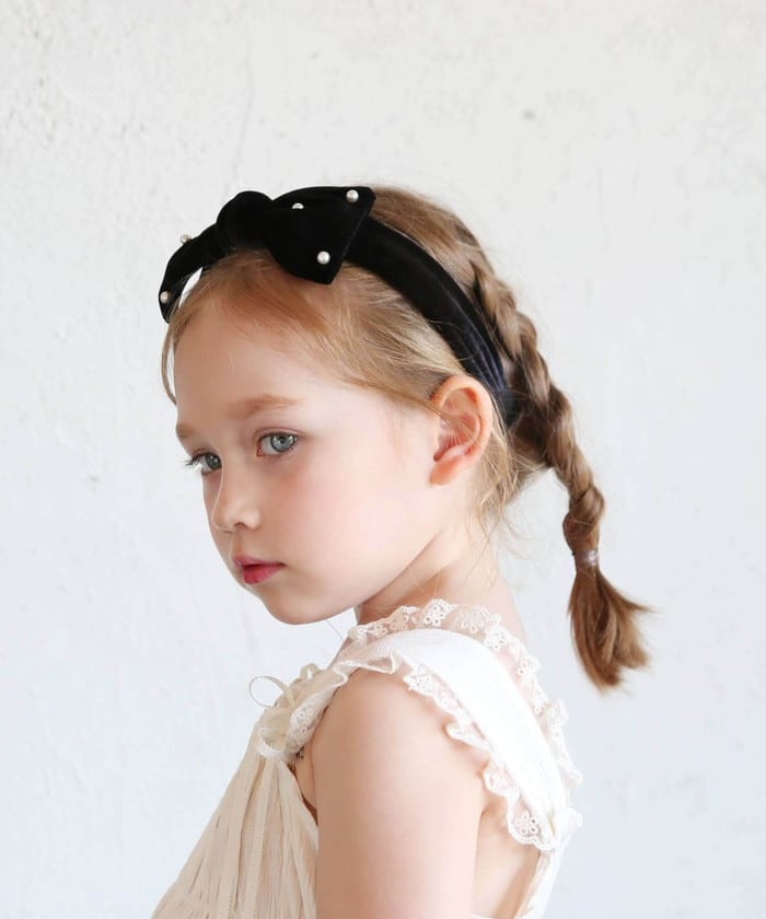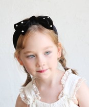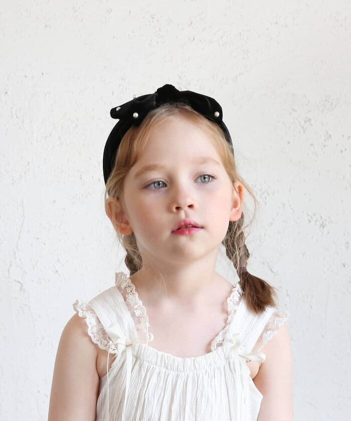・ベロア素材で仕上げたリボンカチューシャにパールが雪のように輝き、幅広で大人っぽいデザインが子供の美しい髪を彩ります。