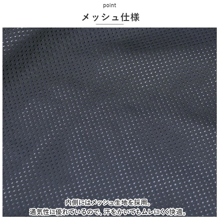 ・内側にはメッシュ生地を採用。通気性に優れているので、汗をかいてもムレにくく快適。