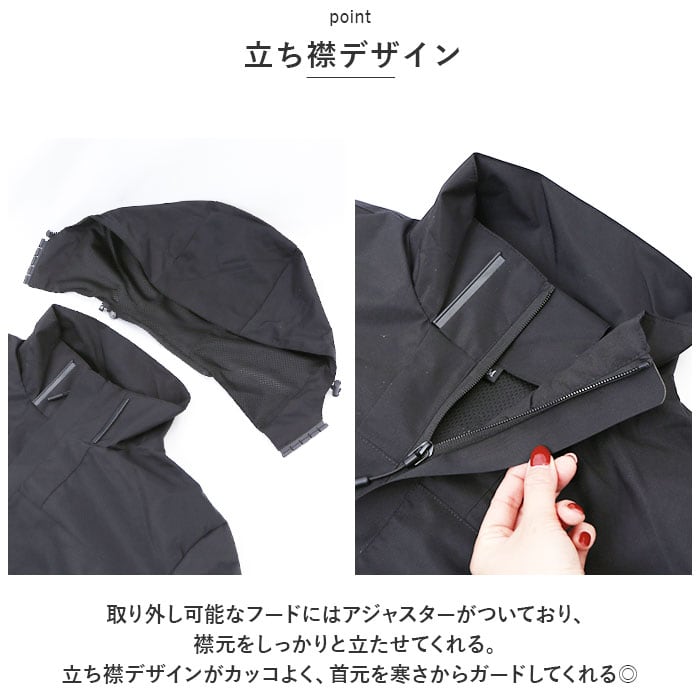 ・取り外し可能なフードにはアジャスターがついており、襟元をしっかりと立たせてくれる。立ち襟デザインがカッコよく、首元を寒さからガードしてくれる◎
