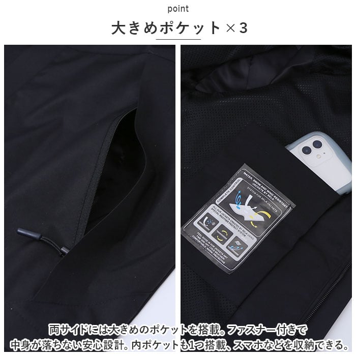 ・両サイドには大きめのポケットを搭載。ファスナー付きで中身が落ちない安心設計。内ポケットも1つ搭載、スマホなどを収納できる。