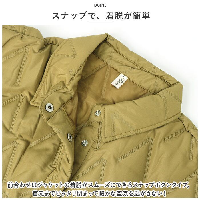 ・前合わせはジャケットの着脱がスムーズにできるスナップボタンタイプ。首元までピッタリ閉まって暖かな空気を逃がさない!