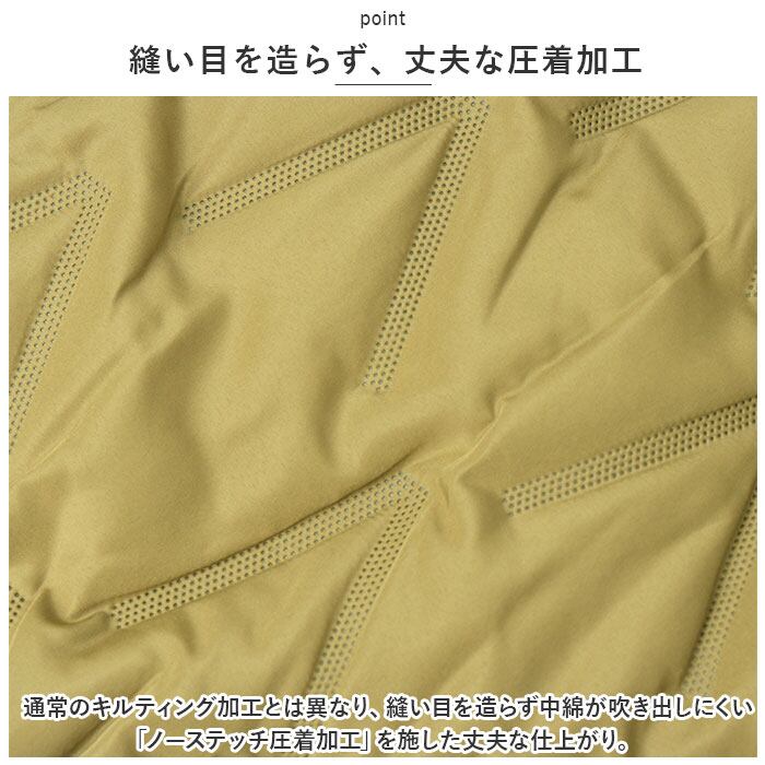・通常のキルティング加工とは異なり、縫い目を造らず中綿が吹き出しにくい「ノーステッチ圧着加工」を施した丈夫な仕上がり。