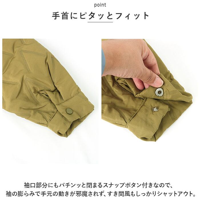 ・袖口部分にもパチンッと閉まるスナップボタン付きなので、袖の膨らみで手元の動きが邪魔されず、すき間風もしっかりシャットアウト。