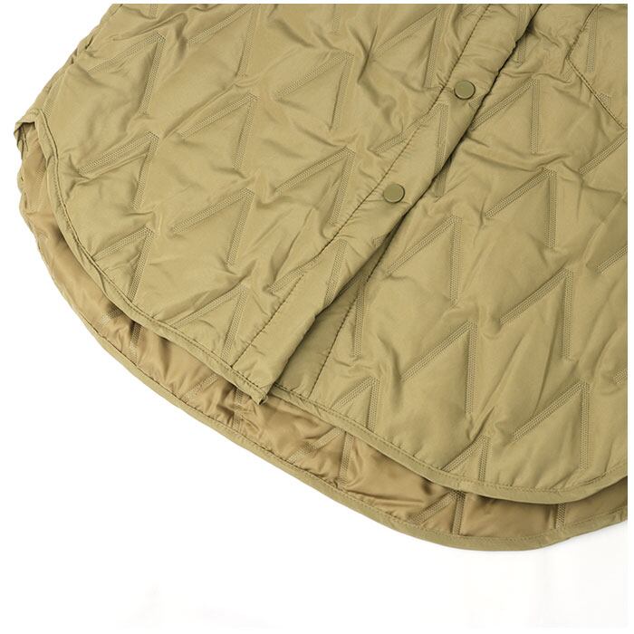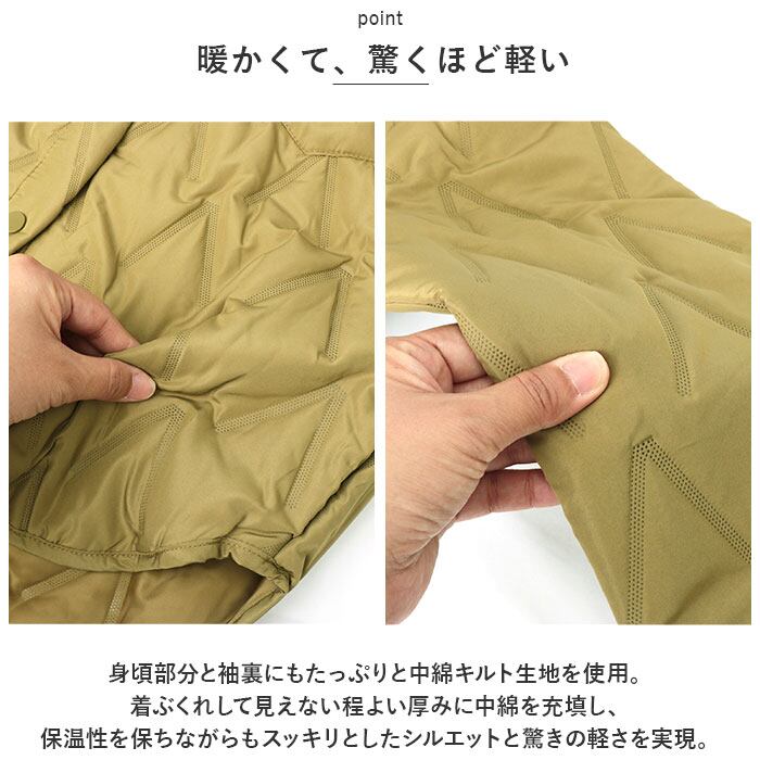 ・身頃部分と袖裏にもたっぷりと中綿キルト生地を使用。着ぶくれして見えない程よい厚みに中綿を充填し、保温性を保ちながらもスッキリとしたシルエットと驚きの軽さを実現。
