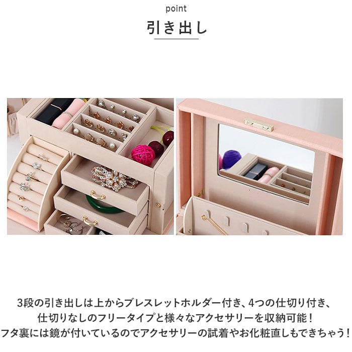 3段の引き出しは上からブレスレットホルダー付き、4つの仕切り付き、仕切りなしのフリータイプと様々なアクセサリーを収納可能!