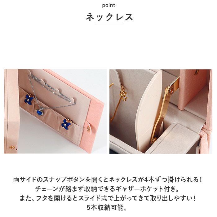 ・両サイドのスナップボタンを開くとネックレスが4本ずつ掛けられる!チェーンが絡まず収納できるギャザーポケット付き。