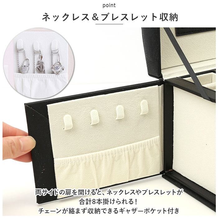 ・両サイドの扉を開けると、ネックレスやブレスレットが合計8本掛けられる!チェーンが絡まず収納できるギャザーポケット付き。