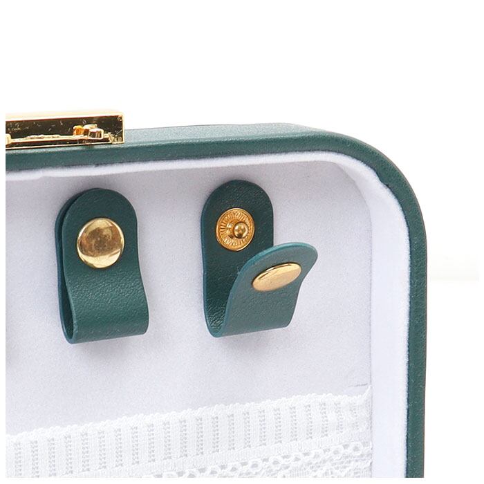 ・フタ裏にはネックレスやブレスレットが4本掛けられる、スナップボタン式バンドを装備!チェーンが絡まず収納できるレース素材のバンド付き。