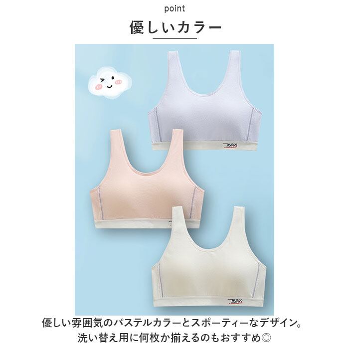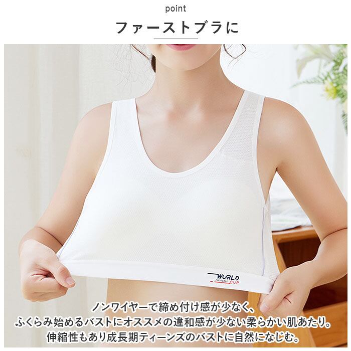 ・ノンワイヤーで締め付け感が少なく、ふくらみ始めるバストにオススメの違和感が少ない柔らかい肌あたり。伸縮性もあり成長期ティーンズのバストに自然になじむ。
