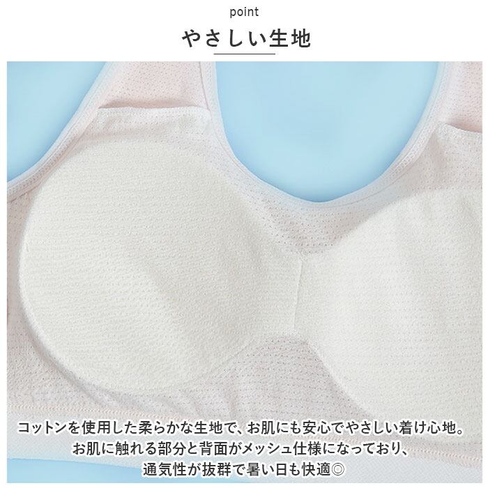 ・コットンを使用した柔らかな生地で、お肌にも安心でやさしい着け心地。お肌に触れる部分と背面がメッシュ仕様になっており、通気性が抜群で暑い日も快適◎
