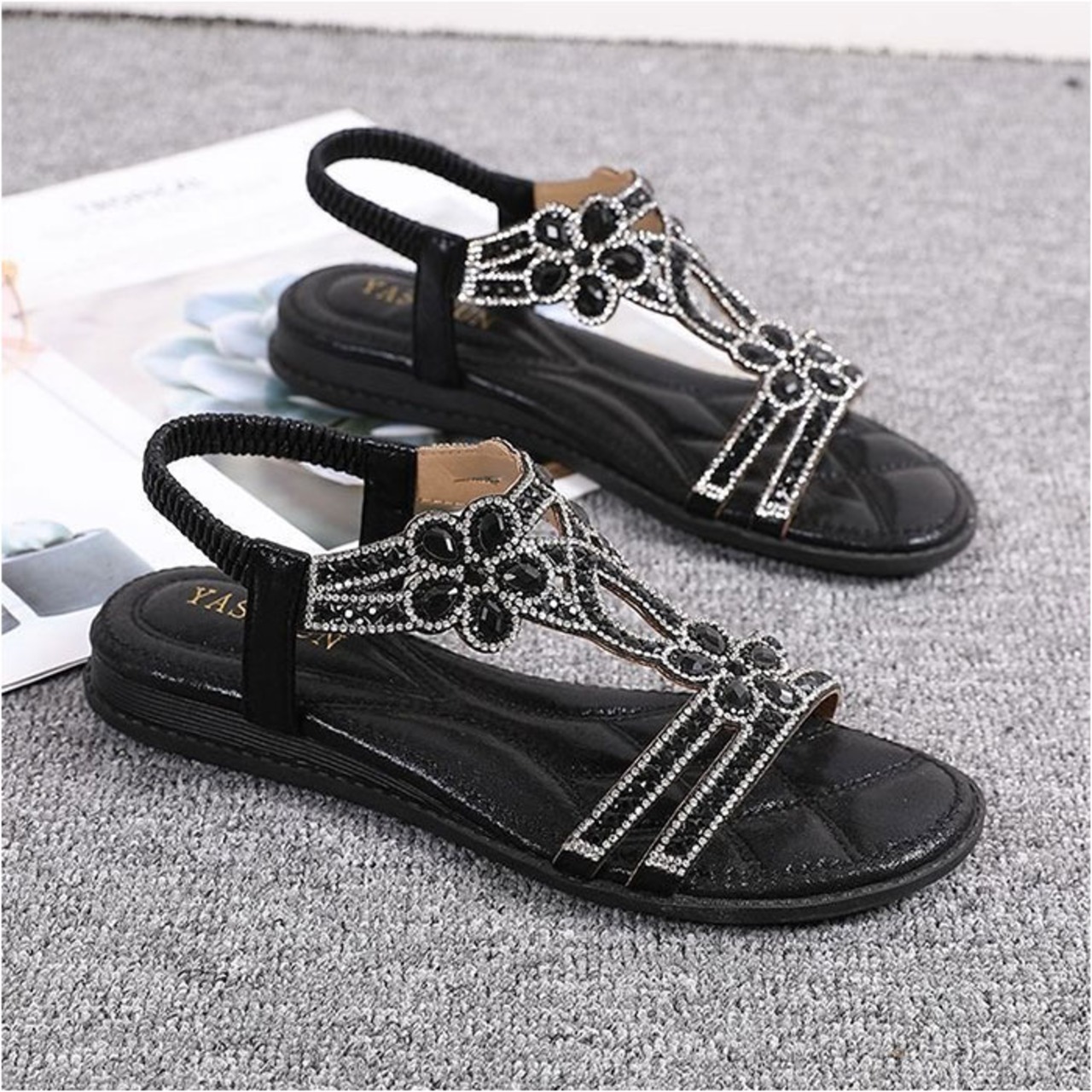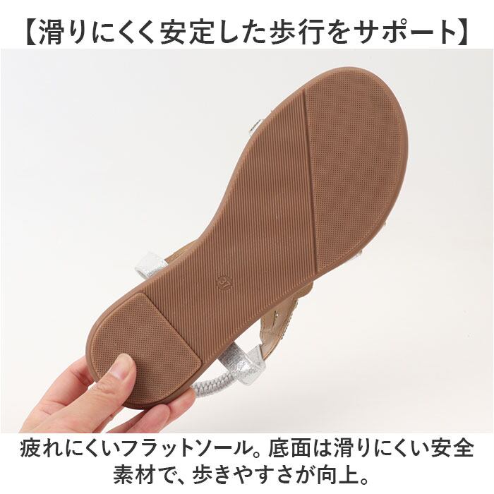 ・疲れにくいフラットソール。底面は滑りにくい安全素材で、歩きやすさが向上。