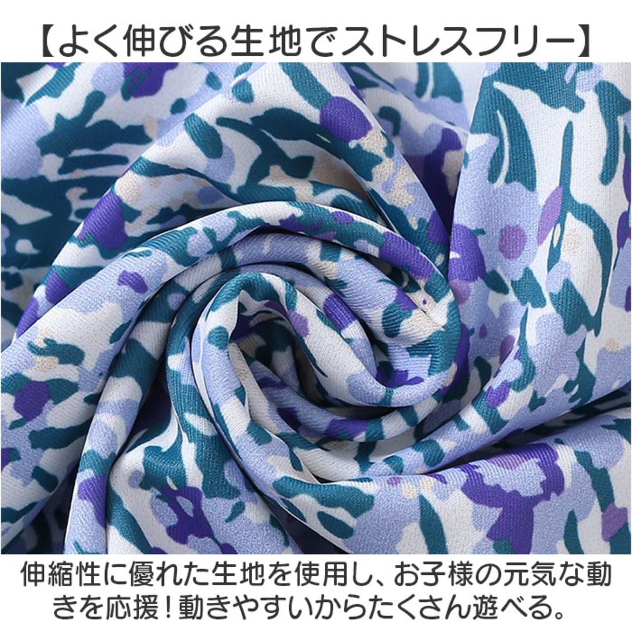 ・伸縮性に優れた生地を使用し、お子様の元気な動きを応援!動きやすいからたくさん遊べる。