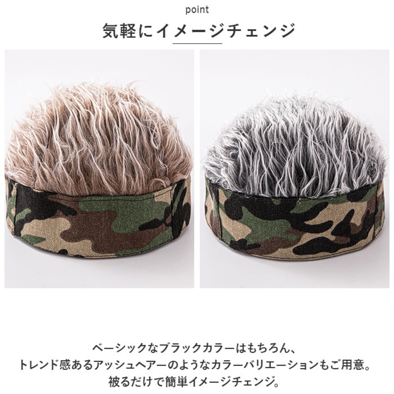 ・ベーシックなブラックカラーはもちろん、トレンド感あるアッシュヘアーのようなカラーバリエーションもご用意。被るだけで簡単イメージチェンジ。