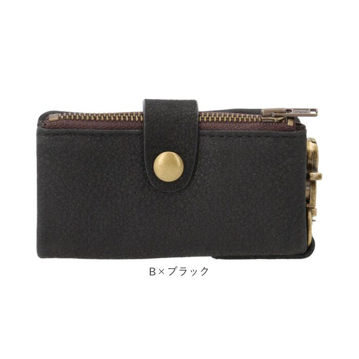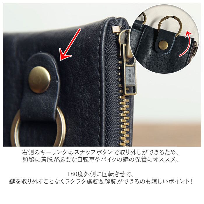 ・右側のキーリングはスナップボタンで取り外しができるため、頻繁に着脱が必要な自転車やバイクの鍵の保管にオススメ。180度外側に回転させて、鍵を取り外すことなくラクラク施錠&解錠ができるのも嬉しいポイント!