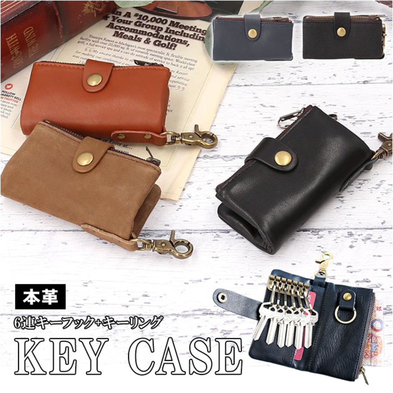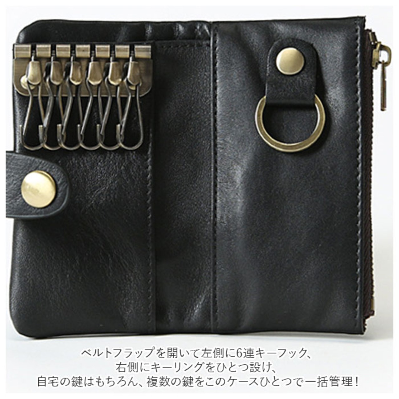 ・ベルトフラップを開いて左側に6連キーフック、右側にキーリングをひとつ設け、自宅の鍵はもちろん、複数の鍵をこのケースひとつで一括管理!